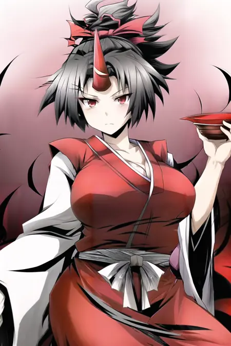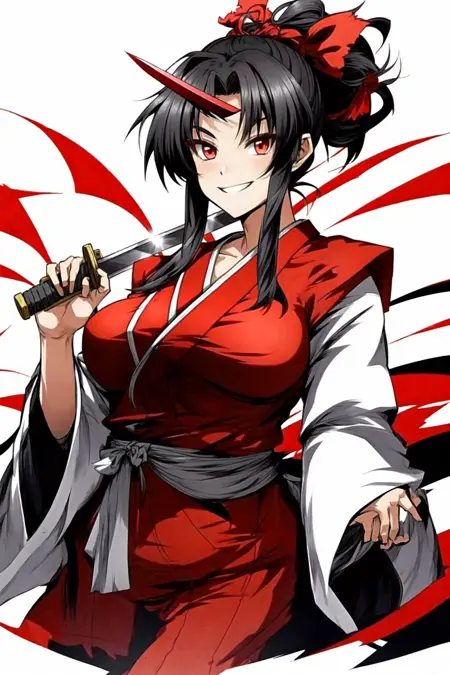 Konngara, wide sleeves, black hair, ponytail, red kimono, long sleeves, sleeveless kimono, grey sleeve, single horn, sash, ribbon, oni horn