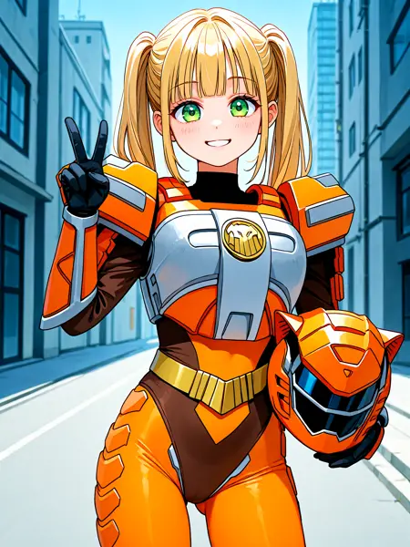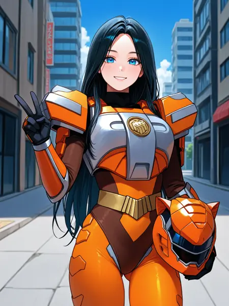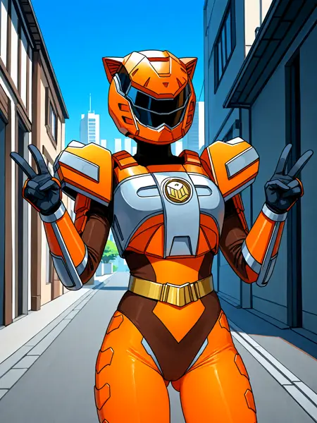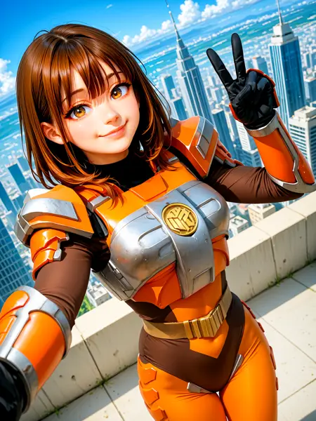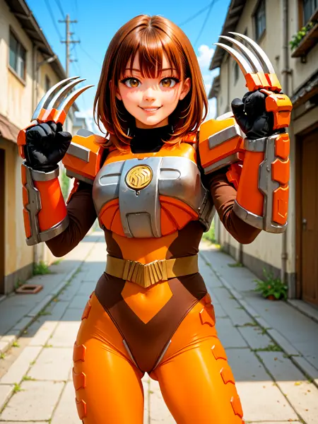 sazervisuel, orange bodysuit, brown leotard, belt, armor, gauntlets, black gloves