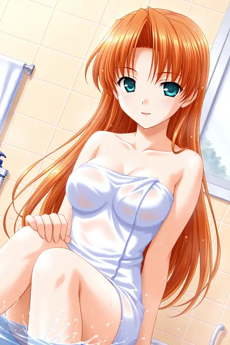 nishina kyouko, aqua eyes, orange hair, parted bangs, hair intakes, very long hair, hair down,リップ (lipstick) ※Trigger に以下を追加