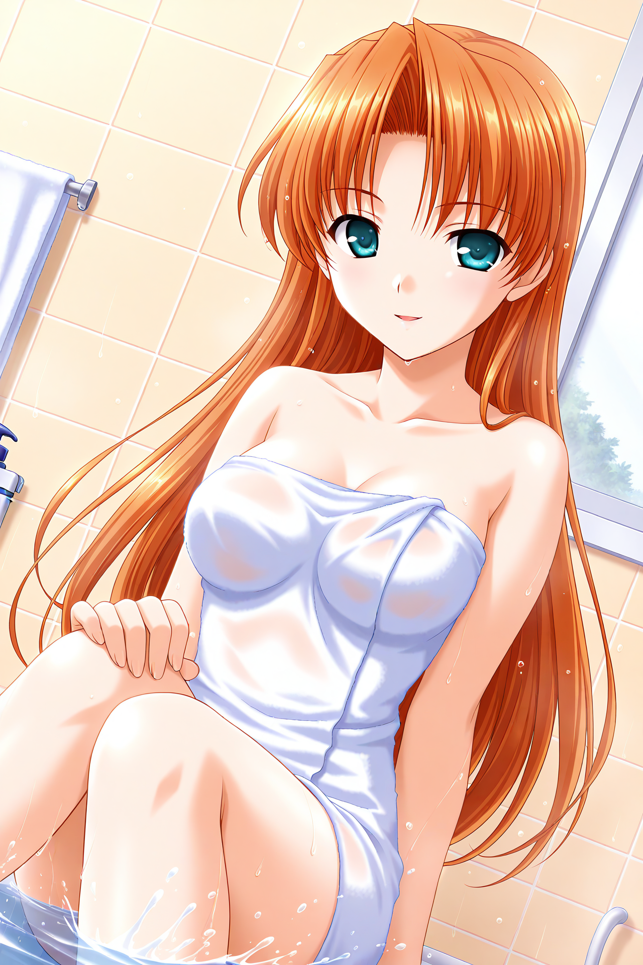 nishina kyouko, aqua eyes, orange hair, parted bangs, hair intakes, very long hair, hair down,