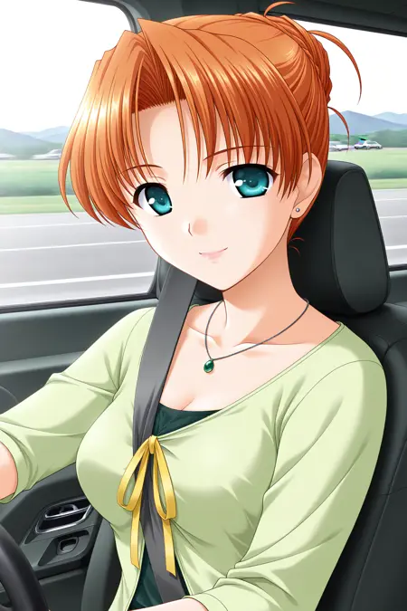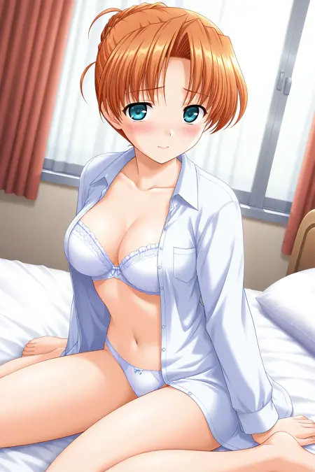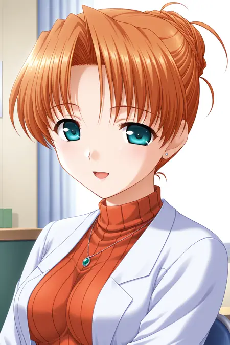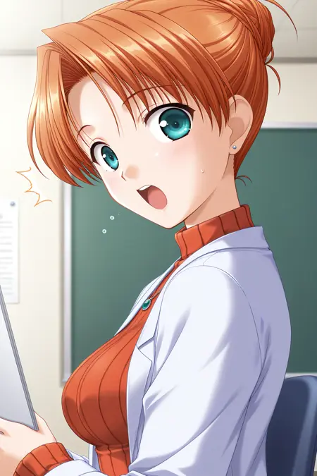 nishina kyouko,aqua eyes,orange hair,short hair,parted bangs,hair intakes,hair up,folded ponytail,single hair bun,ahoge,mature female,stud earrings,