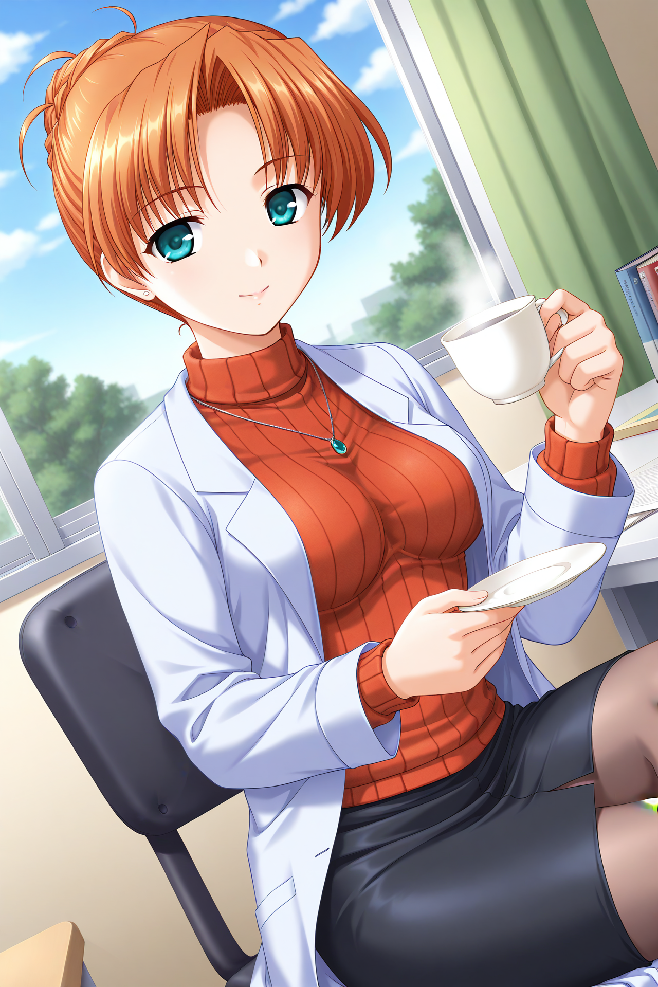 teacher, labcoat, open coat, necklace, orange sweater, turtleneck sweater, ribbed sweater, long sleeves, impossible clothes, black skirt, miniskirt, pencil skirt, black pantyhose,