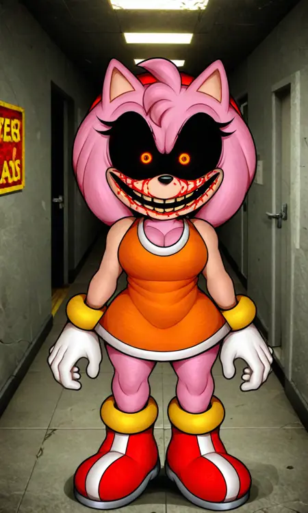 (触发词:thorn, hedgehog, exe, 粉色毛发, 红色瞳孔, 黑色巩膜, 满脸血迹, 阴森微笑)