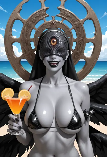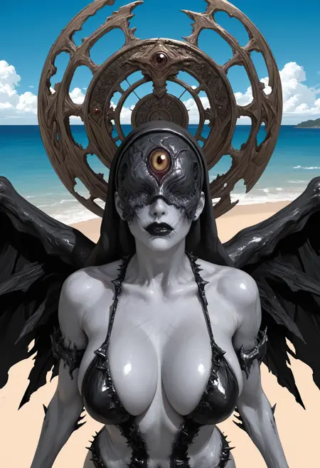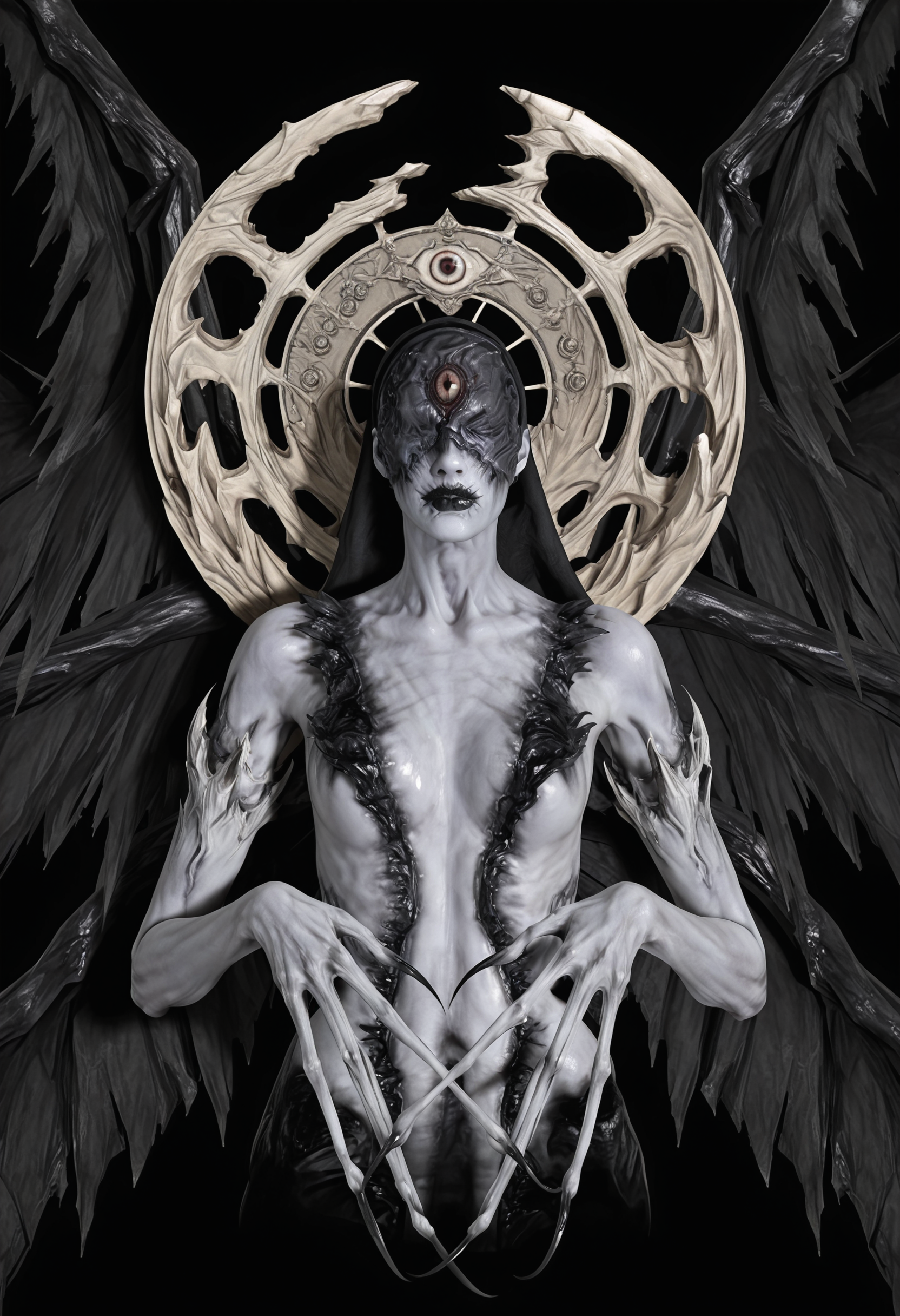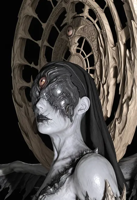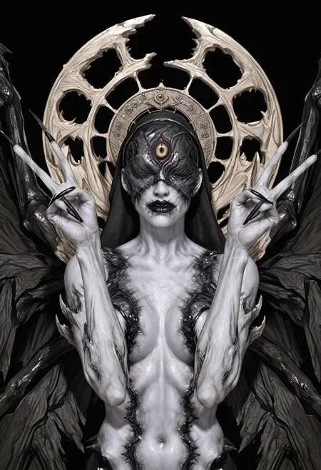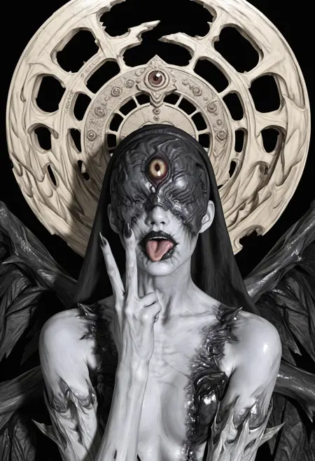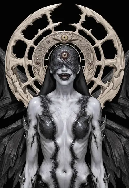m0uilf, 1girl, 머리 뒤에 할로, 베일, 회색 피부, 컬러링된 피부, 날개, 돌기, 사이클롭, 발톱, 검은 입술