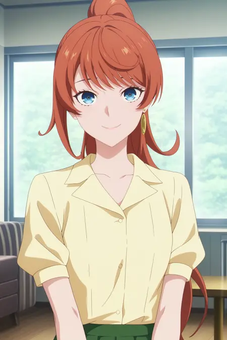anna schneider, 长发, 橙色头发, 马尾, 不对称刘海, 蓝眼睛, 单耳环, 短袖, 黄色衬衫, 有领衬衫, 手表, 手链, 绿色裙子, 百褶裙, 棕色鞋履, 凉鞋