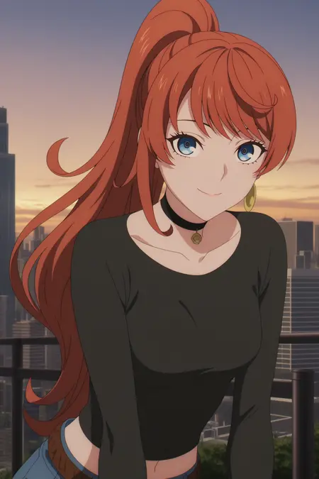 anna schneider, 长发, 橙色头发, 马尾, 不对称刘海, 蓝眼睛, 单耳环, 吊坠项圈, 长袖, 黑色衬衫, 紧身衬衫, 手表, 手链, 腰带, 蓝色裤子, 喇叭裤, 破洞牛仔裤, 棕色鞋履, 运动鞋