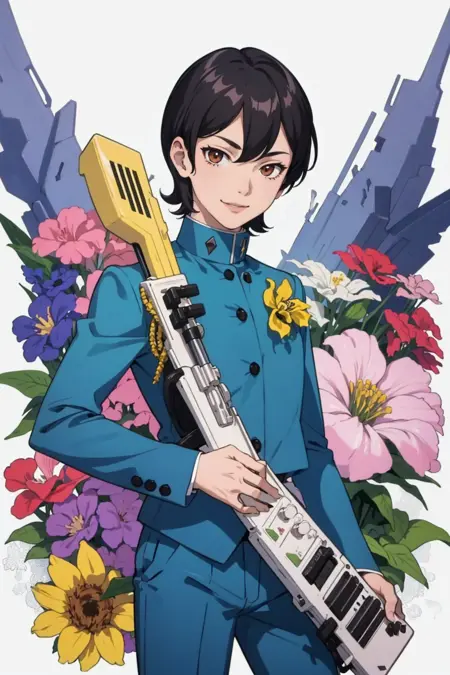 For his normal outfit it's "school uniform, gakuran, flower, pants"