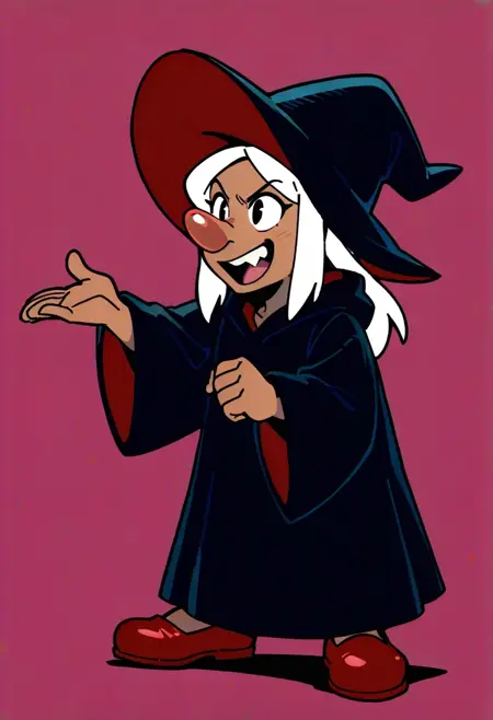 Witchcart, 1girl, witch, tan skin, black eyes, white hair, single tooth, black robe, witch hat with red inside, red shoes, short, big nose,