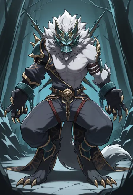 主服装:面具、哈达努吉多萨、裤子、单肩甲、手臂绳索、袖扣、腰带、大腿绑带、腿甲、爪子(武器)、背部尖刺、腰披风,