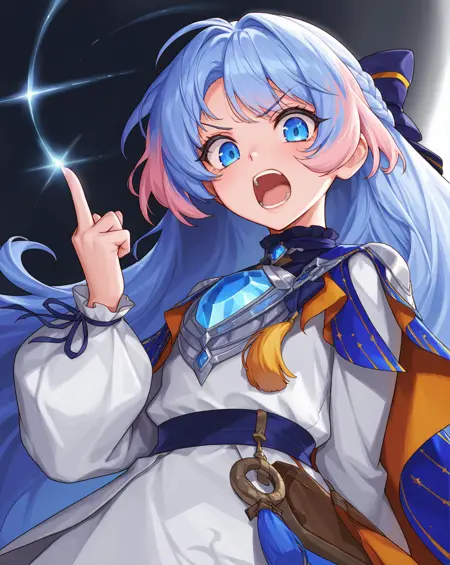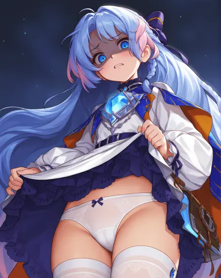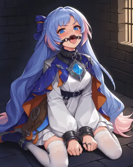 DNF神界NPC,舒茉,由立绘+像素图训练而成,灵活性可能较差,凑合玩,如果粉色头发过多请删除粉色头发标签,关键词shume,1girl,blue eyes,blue hair,very long hair,braid,multicolored hair,long sleeves,bow,hair bow,cape,white dress,hair ribbon,white thighhighs,
