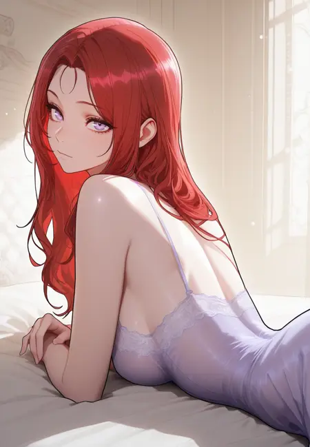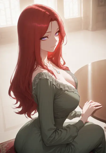 eleanormariche, 1girl, 빨간 머리, 긴 머리, 보라색 눈,