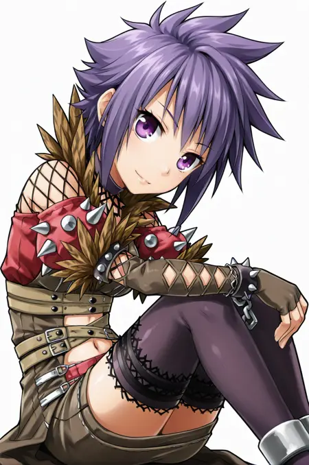 prompt: scRO, thighhighs, fingerless elbow gloves, navel, midriff, spiked bracelet, choker, pencil skirt, jewelry, belts, detached puffy sleeves, feather trim, fishnets, chain, spikes, lace-trimmed legwear, anklet boots,