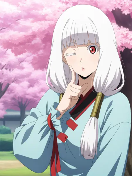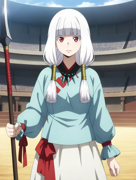 Lady_Jose, white hair, long hair, red eyes, white eyelashes, bangs, twintails, hair tubes, 1girl, official style, anime_screencap