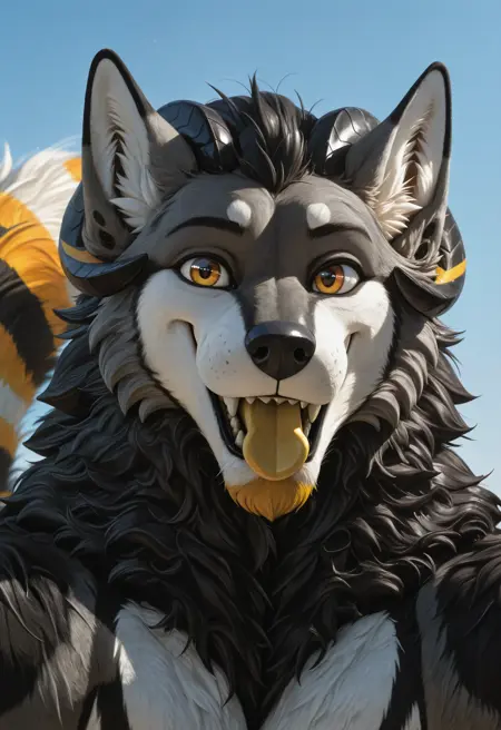 renki_blackwolf, wolf boy, 1boy, furry, furry male, male focus, solo, horns, body fur, striped tail, long tail, fluffy tail, bara, ears spots, yellow beard, yellow mouth