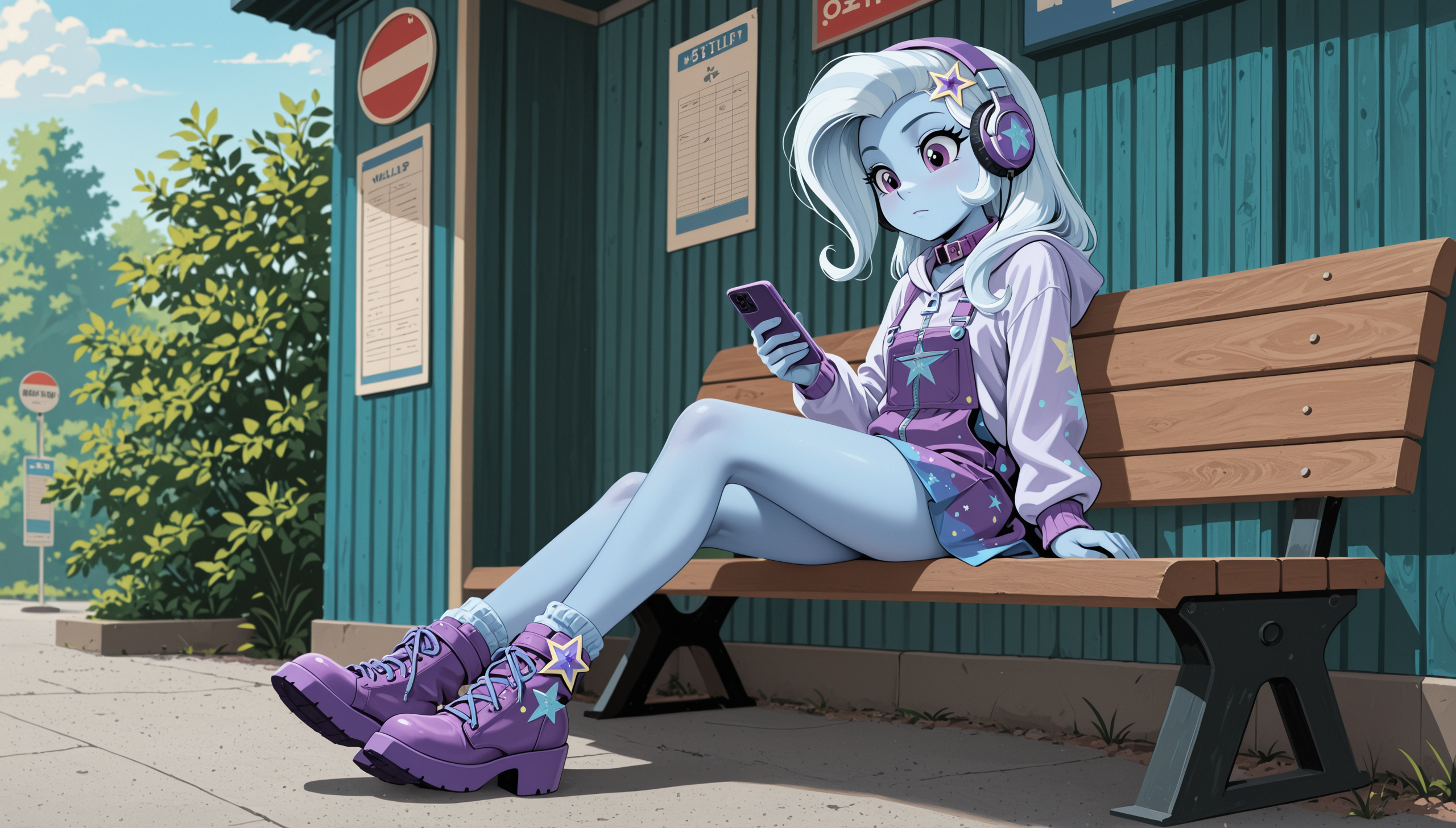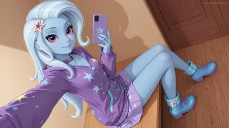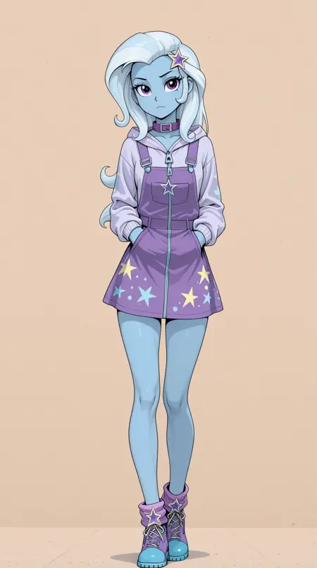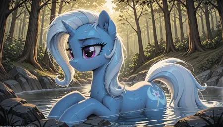 blue body, purple eyes, long wavy mane and tail silver-white with blue accents,
