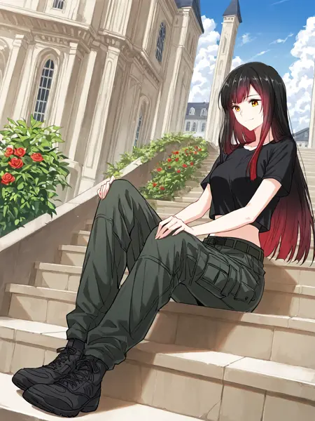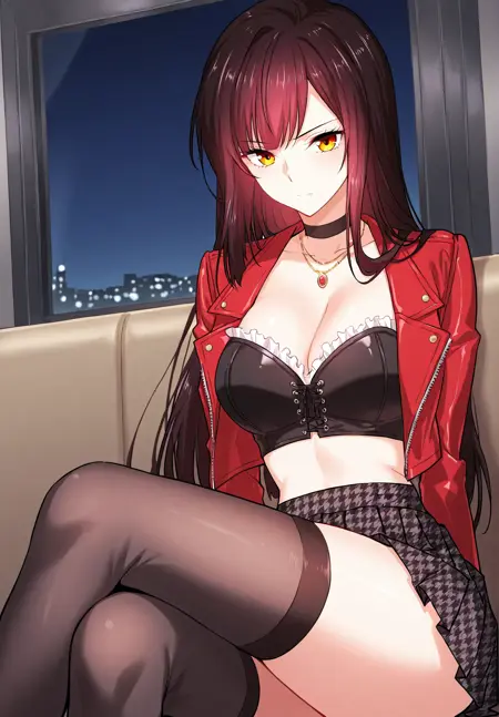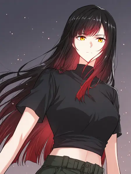| 训练词汇 | 1 girl, solo, long hair, straight hair, gradient hair, dark red hair, bangs, golden eyes, 已复制! black crop top, black leather jacket, high-waisted pants, tight jeans, black boots, 已复制! red cropped jacket, crop top, black bustier top, houndstooth skirt, short pleated skirt, thigh-high socks, black stockings, choker, necklace, 已复制! black one-shoulder top, tight black top, long sleeve top, black pencil skirt, tight skirt, high heels,已复制! black crop t-shirt, short sleeve shirt, tactical pants, cargo pants, black pants, utility pockets,已复制! |