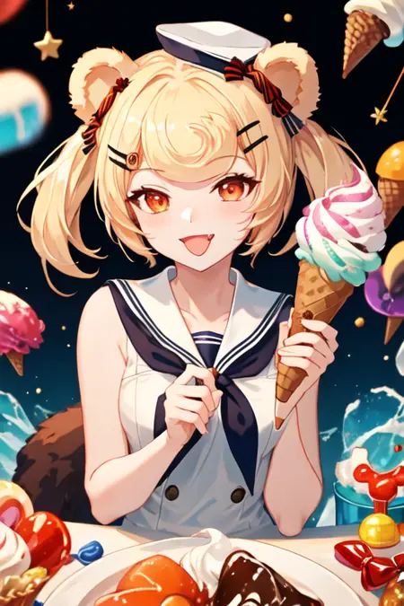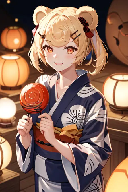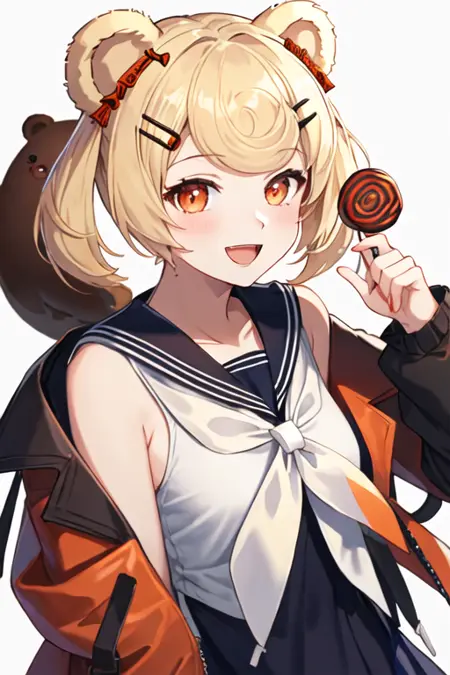触发词为 gum_arknights,推荐标签为:best quality, masterpiece, highres, solo, {gum_arknights:1.15}, animal_ears, blonde_hair, bear_ears, short_hair, hair_ornament, candy_hair_ornament, hairclip, food-themed_hair_ornament, bangs, smile, orange_eyes, upper_body, red_eyes。