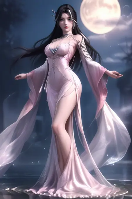 donghua, beautiful, 1girl, black hair, blue eyes, white highlights, masterpiece, best quality, amazing quality, looking at viewer, realistic, pink dress, purple gem, hair ornament