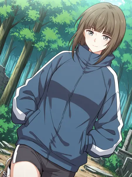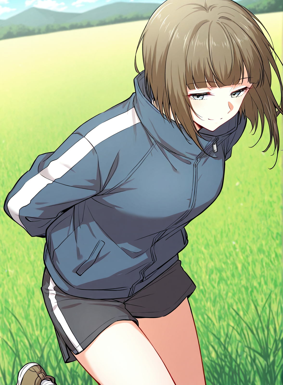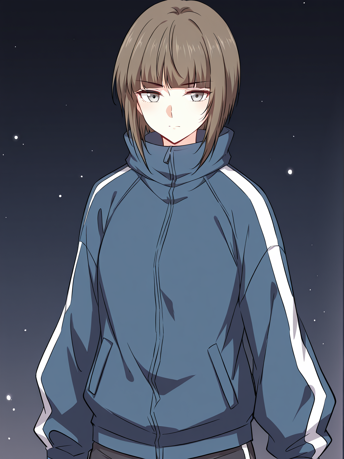 1 girl, solo, short hair, straight hair, brown hair, blunt bangs, grey eyes,
