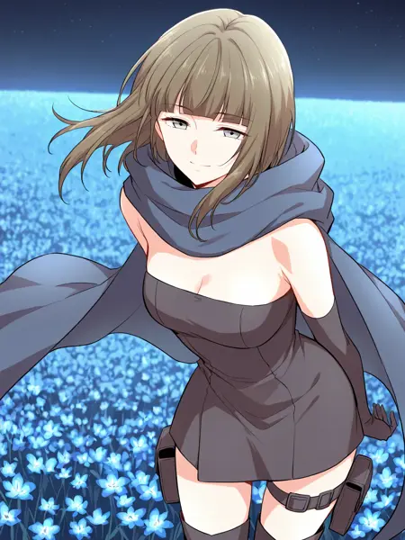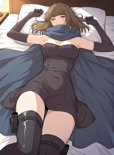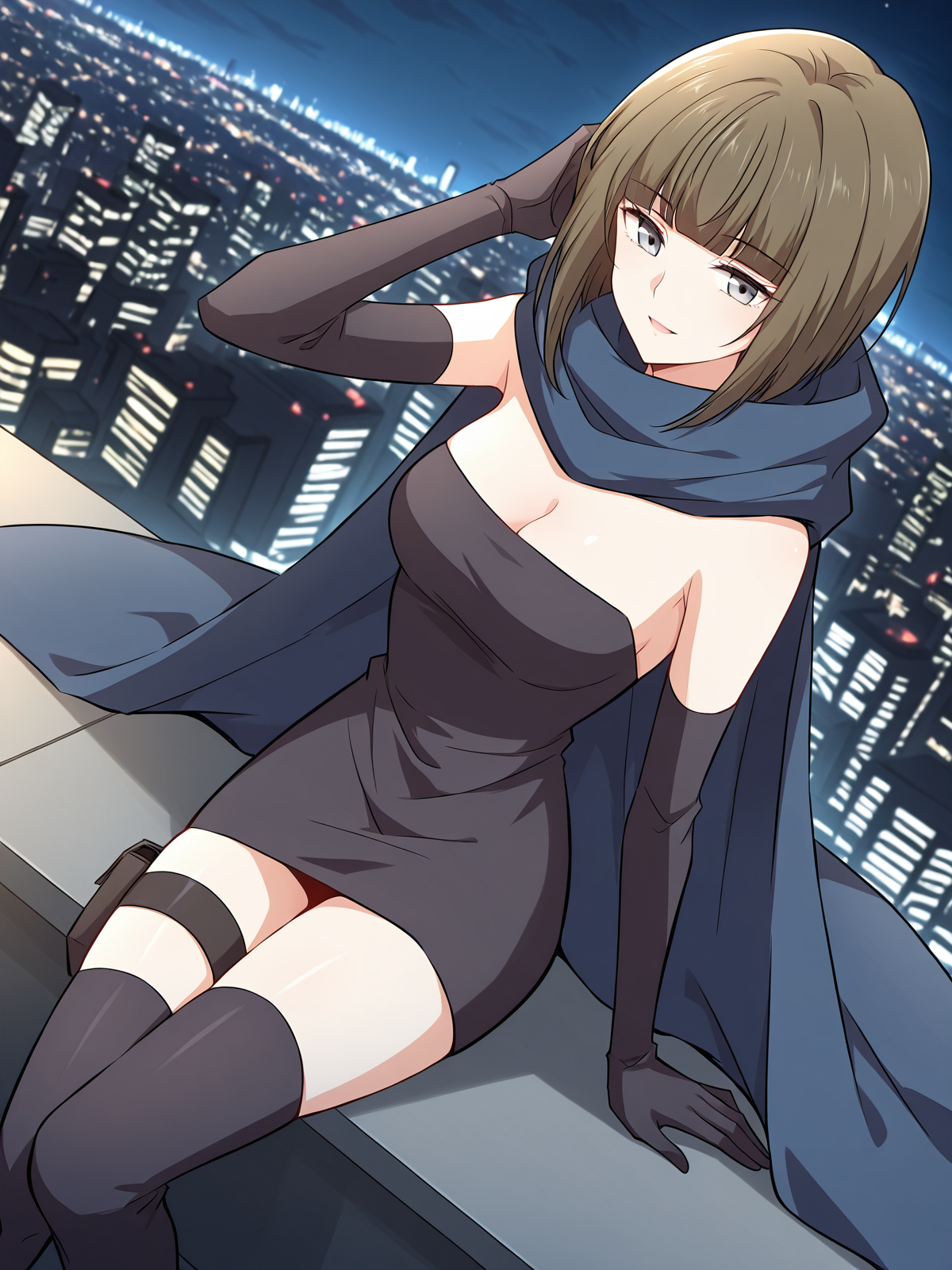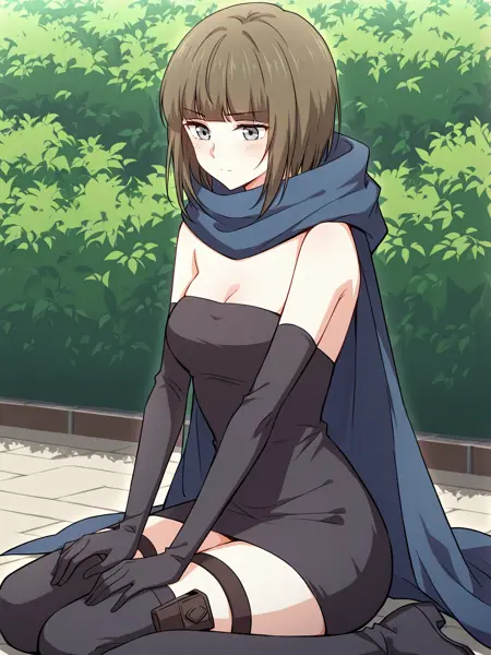 black strapless dress, long gloves, thigh holster, thigh high boots, dark blue scarf, dark blue cape,