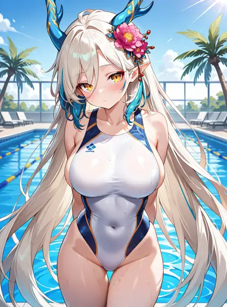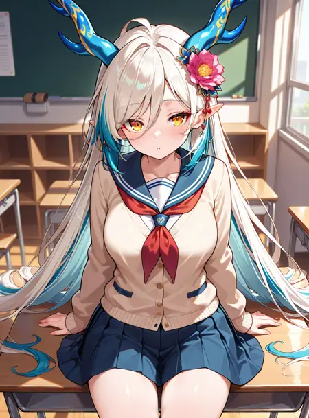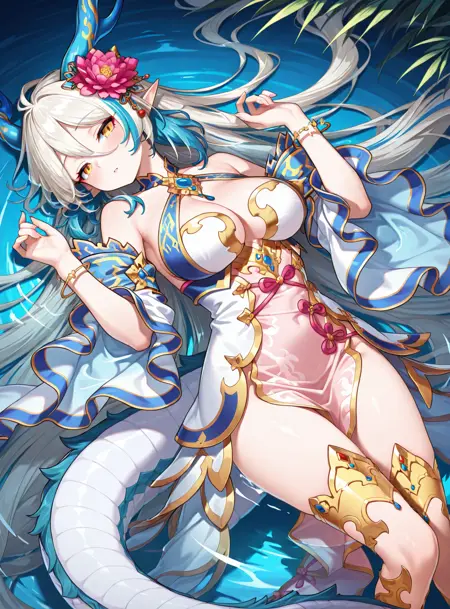 "ZennyoRyuuou, very long hair, dragon horns, hair flower, pointy ears,"