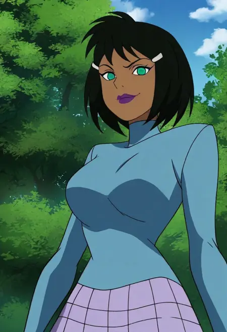 | Trained Words | StaticMadelynSpaulding, 1girl, dark-skinned female, black hair, short hair, bob cut, hairclip, hair ornament, aqua eyes, green eyes, makeup, lipstick, purple lips,Copied! breasts, medium breasts, turtleneck, sweater, blue shirt, blue sweater, long sleeves, skirt, purple skirt, plaid skirt, pleated skirt, miniskirt,Copied! white footwear, shoes, high heelsCopied! glowing eyes, no pupils, purple eyes,Copied! |