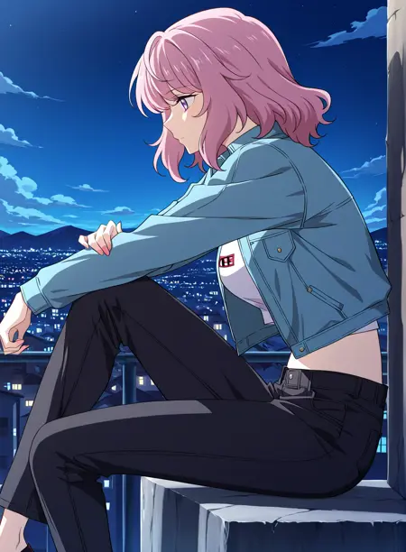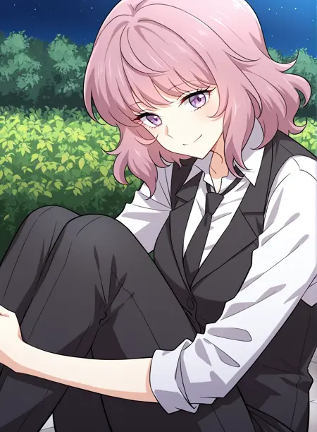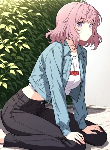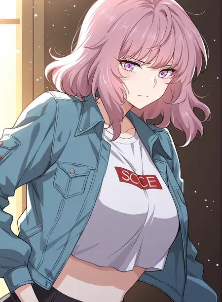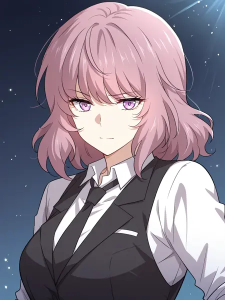 1 girl, solo, medium hair, wavy hair, pink hair, purple eyes,