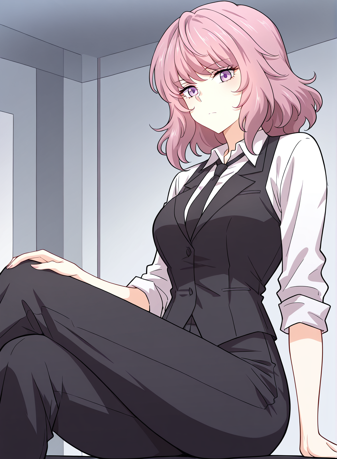 white collared shirt, black vest, black dress pants, black necktie, office outfit, sleeves rolled up, formal clothing,
