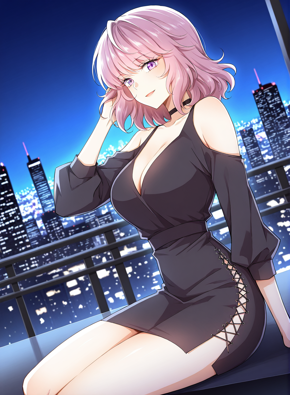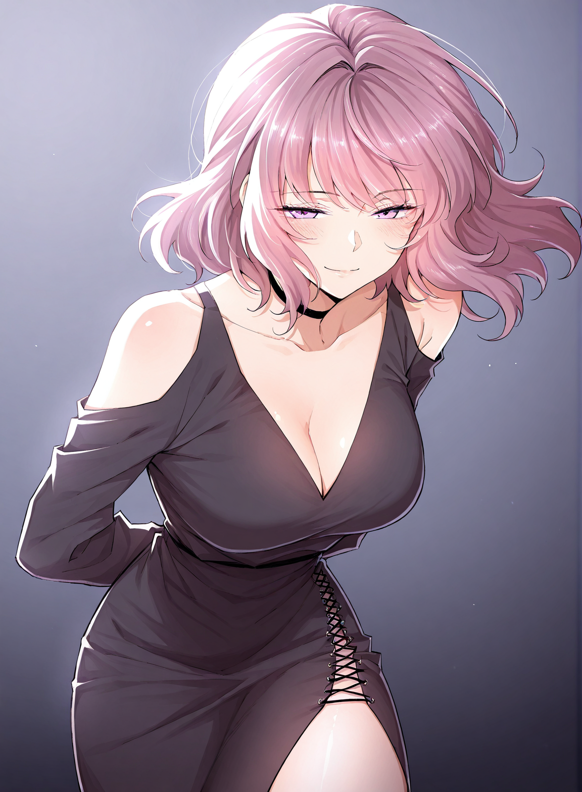 black cold shoulder dress, deep v-neck, lace-up side slit, tight dress, black choker,