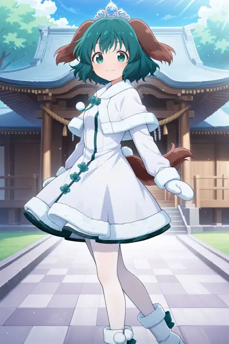 kasodani kyouko, 1girl, solo, green eyes, green hair, medium hair, dog ears, dog tail, alternate costume, tiara, white capelet, fur-trimmed capelet, pom pom (clothes), white dress, fur-trimmed dress, fur-trimmed sleeves, long sleeves, white pantyhose, white boots, fur-trimmed boots, white mittens,