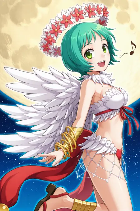 프롬프트: wanderRO, 여섯 개의 날개, 팔찌, 배꼽, 복부, 깃털, 팔찌, 빨간 속옷, 어깨 노출, 팔찌, 스트랩 없는 브라, 빨간 리본, 앞팔 보호대, 허벅지 보호대, 발목 보호대, 샌들, 하이힐,