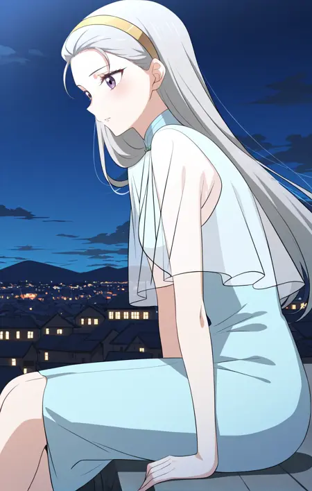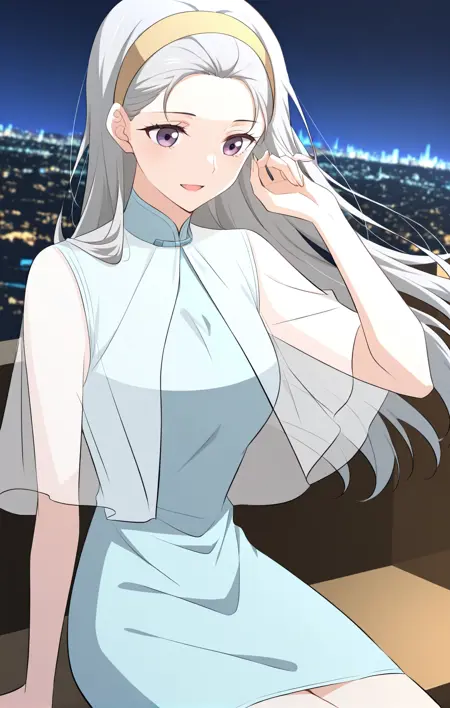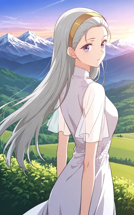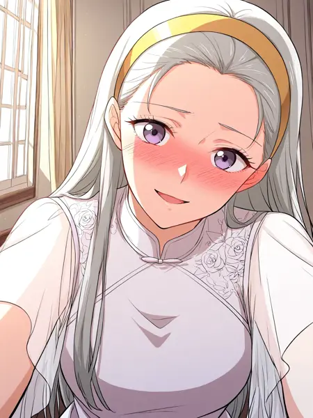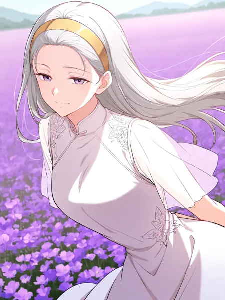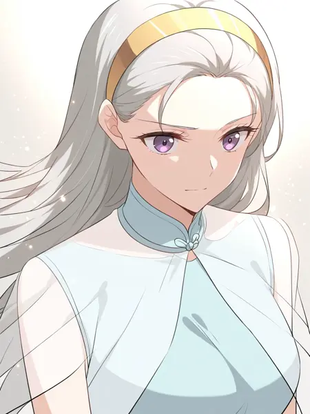 1 girl, solo, long hair, straight hair, silver hair, side parted bangs, golden headband, purple eyes,