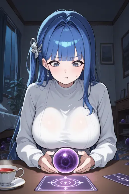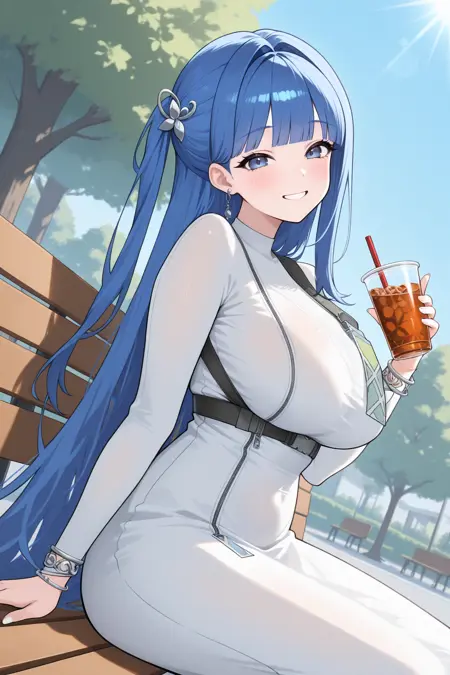 외모: arc4na, 큰 가슴, 파란 눈, 파란 머리, 곧은 앞머리, 한쪽 위로 올린 머리, 머리 끝부분, 한쪽 머리카락, 매우 긴 머리, 머리 장식, 은색 손톱, 한쪽 귀걸이
