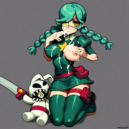 (Skullgirls_Annie, long hair, twin braids, braid, green hair, yellow eyes, eyepatch, star (symbol), stuffed animal, sword, belt pouch, thigh boots, red belt, green dress, thighhighs, thigh straps),