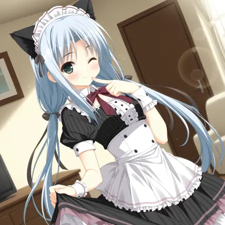 cat ears,black ears,maid headdress,maid,wrist cuffs,red bowtie,puffy short sleeves,layered dress,waist bow,white bow,frills,striped clothes,