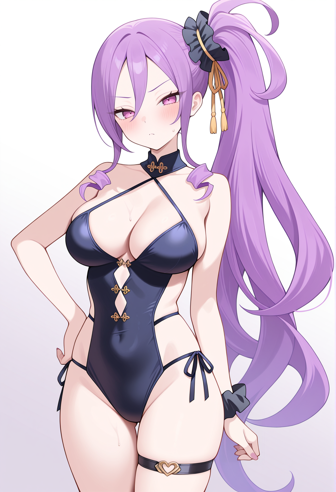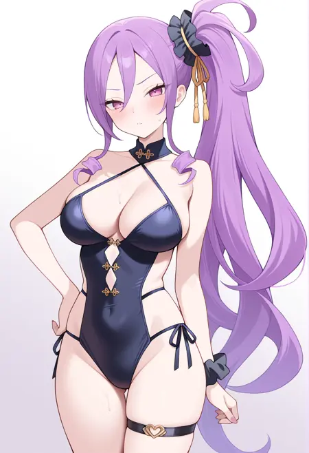 大きな胸、紫髪、紫の目、カールした髪、非常に長い髪、サイドポニー、黒いスクランチ、ワンピース水着、サイドタイ水着、腕輪、太ももストラップ
