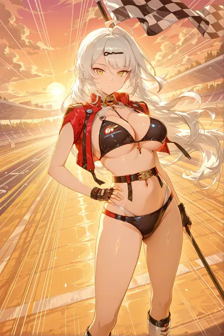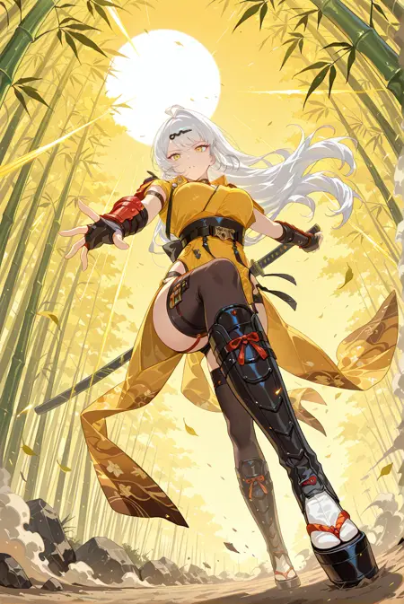 デフォルト:yi-xu、1girl、白髪、黄色い目、ヘアクリップ、アホ毛、片側の髪の毛の流れ、非常に長い髪、ノースリーブコート、黄色のコート、開いたコート、白いシャツ、衿付きシャツ、胸元のカットアウト、サイドブーブ、フィンガーレスグローブ、黒いグローブ、非対称グローブ、片方の肘グローブ、ハイウエストショートパンツ、黒いショートパンツ、太ももストラップ、片方のハイソックス、黒いハイソックス