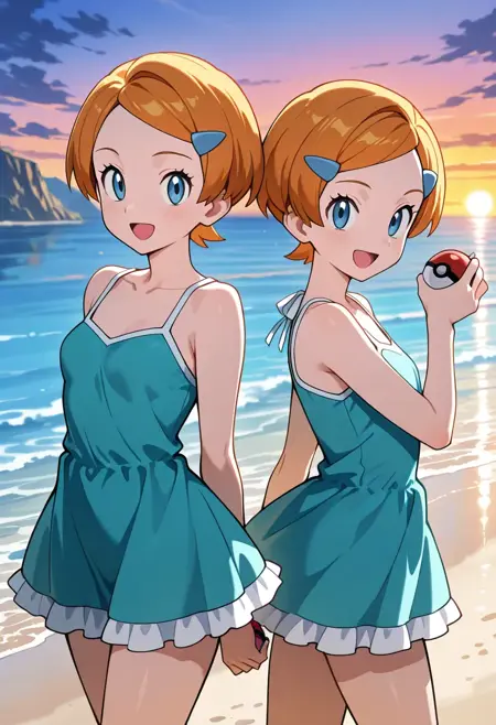 twins,orange hair,aqua dress,very short hair,off-shoulder dress,hairclip,forehead,swept bangs,sleeveless,white socks,blue footwear,