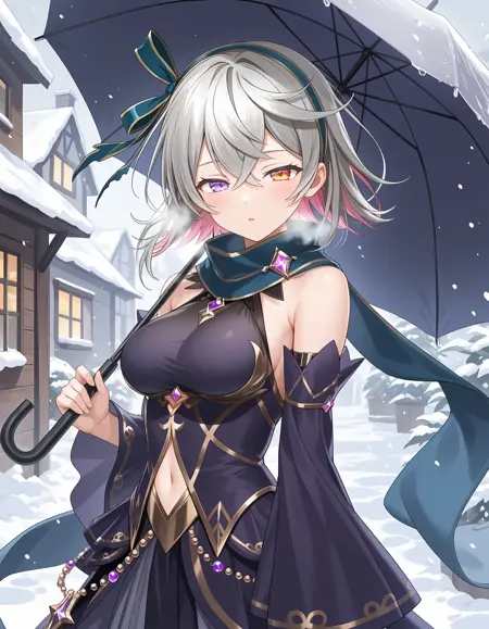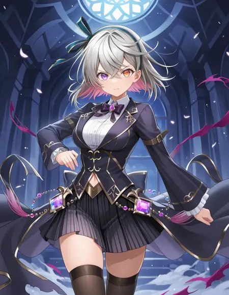 shironeko project,eleanor \(shironeko project\),grey hair,colored inner hair,multicolored hair,two-tone hair,medium hair,hair between eyes,crossed bangs,hairband,bow hairband,(heterochromia),purple eyes,orange eyes,medium breasts
