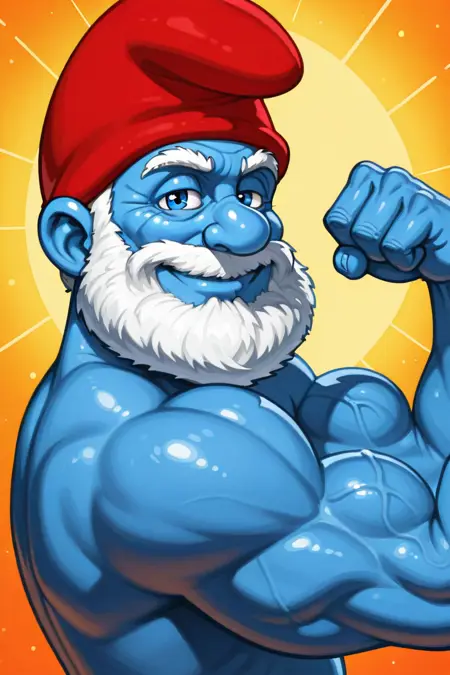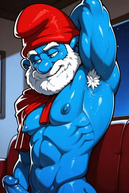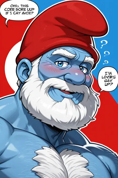 Papa Smurf, solo, male, elderly, blue eyes, white eyebrows, blue skin, white beard, line, red hat, red pants, red shoes