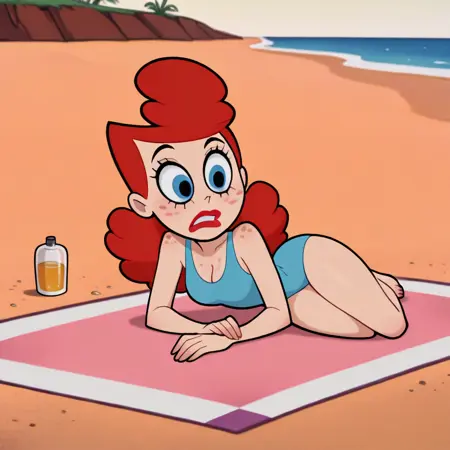 1girl, solo, red hair, blue eyes, freckles, red lipstick, cleavage, blue one-piece swimsuit,