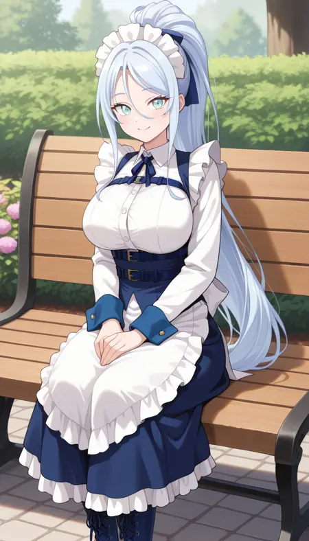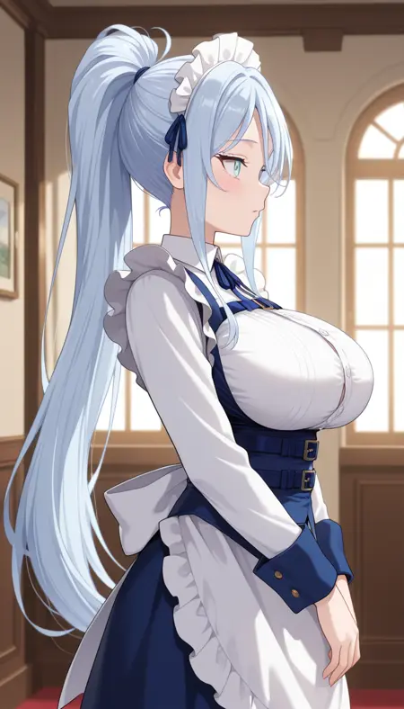 服装1:马尾辫,女仆,女仆头饰,白色衬衫,扣式衬衫,蓝色丝带,蓝色连衣裙,蓝色腰带,女仆围裙,白色围裙,白色袖子,蓝色袖口,背后蝴蝶结,白色蝴蝶结