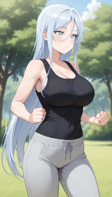 服装3:直发,黑色背心,灰色裤子,运动裤
