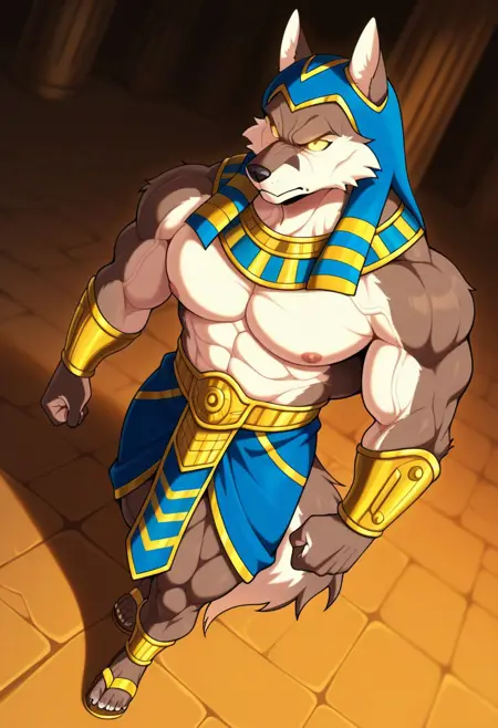 의상 프롬프트: "이집트 복장, 파란 헤드슈, 파란 로인클로스, 금장신, 팔보호대"