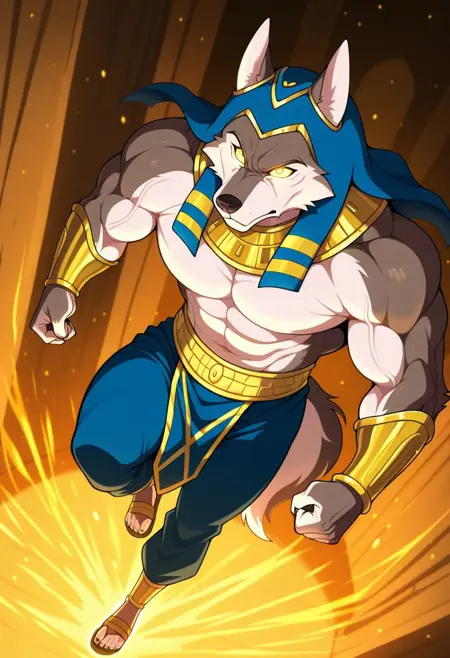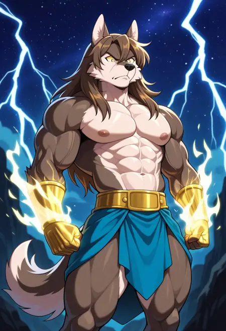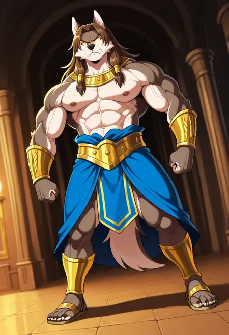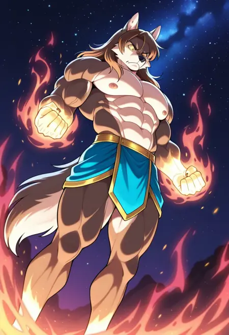 강화 프롬프트: "피리, 늑대, 갈색 털, 노랑 공막, 갈색 눈, 근육질, 바라, 남성적, 성숙, 긴 머리"