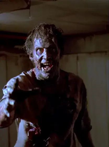 "A man with a gaunt, pale face, sunken eyes, and thin lips. He has short, disheveled hair and is wearing a dark, stained jacket over a red shirt. He is pointing at the viewer with his right hand, which is also stained. The background is a concrete wall with visible cracks and splatters of paint in various shades of green, brown, and gray. The camera angle is straight-on, capturing the man from the front."