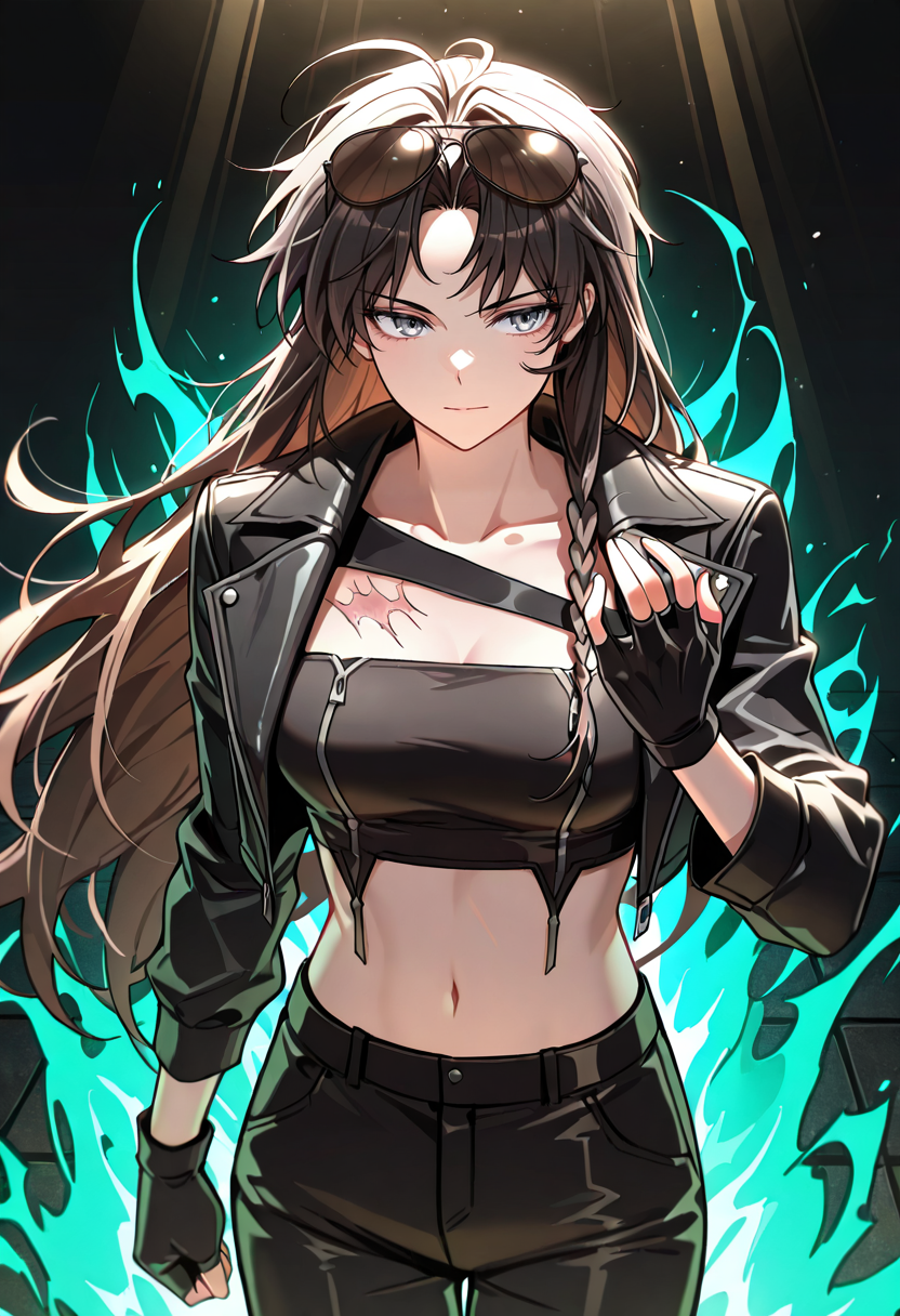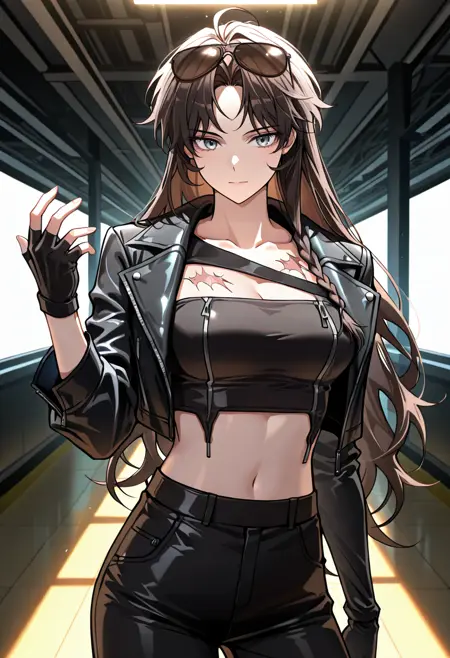 | 训练词汇 | LeeYerin, long hair, black hair, parted bangs, grey eyes, side braid, brown hair, ahoge, messy hair, 已复制! shrug (clothing), single bare shoulder, scar on chest, black tube top, strapless, long sleeves, single sleeve, black gloves, fingerless gloves, crop top, black pants, sunglasses, eyewear on head, 已复制! black jacket, cropped jacket, leather jacket,已复制! |