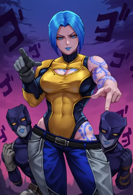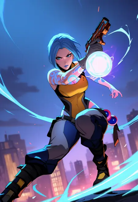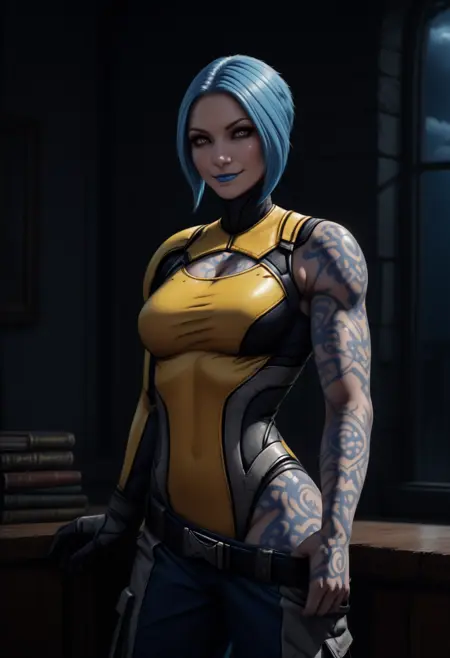Look Tags: blue hair, short hair, lipstick, blue lips, grey eyes, arm tattoo, blue tattoo
