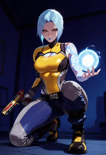 Clothes Tags: asymmetrical clothes, high collar, yellow leotard, cleavage cutout, single sleeve, single glove, grey gloves, black belt, book strap, lowleg pants, multicolored pants, grey pants, blue pants, combat boots