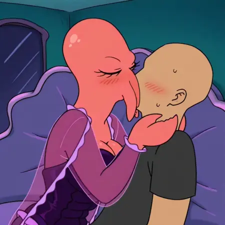 alien female, pink skin, blue sclera, black eyes, mouth flaps, pincer hands